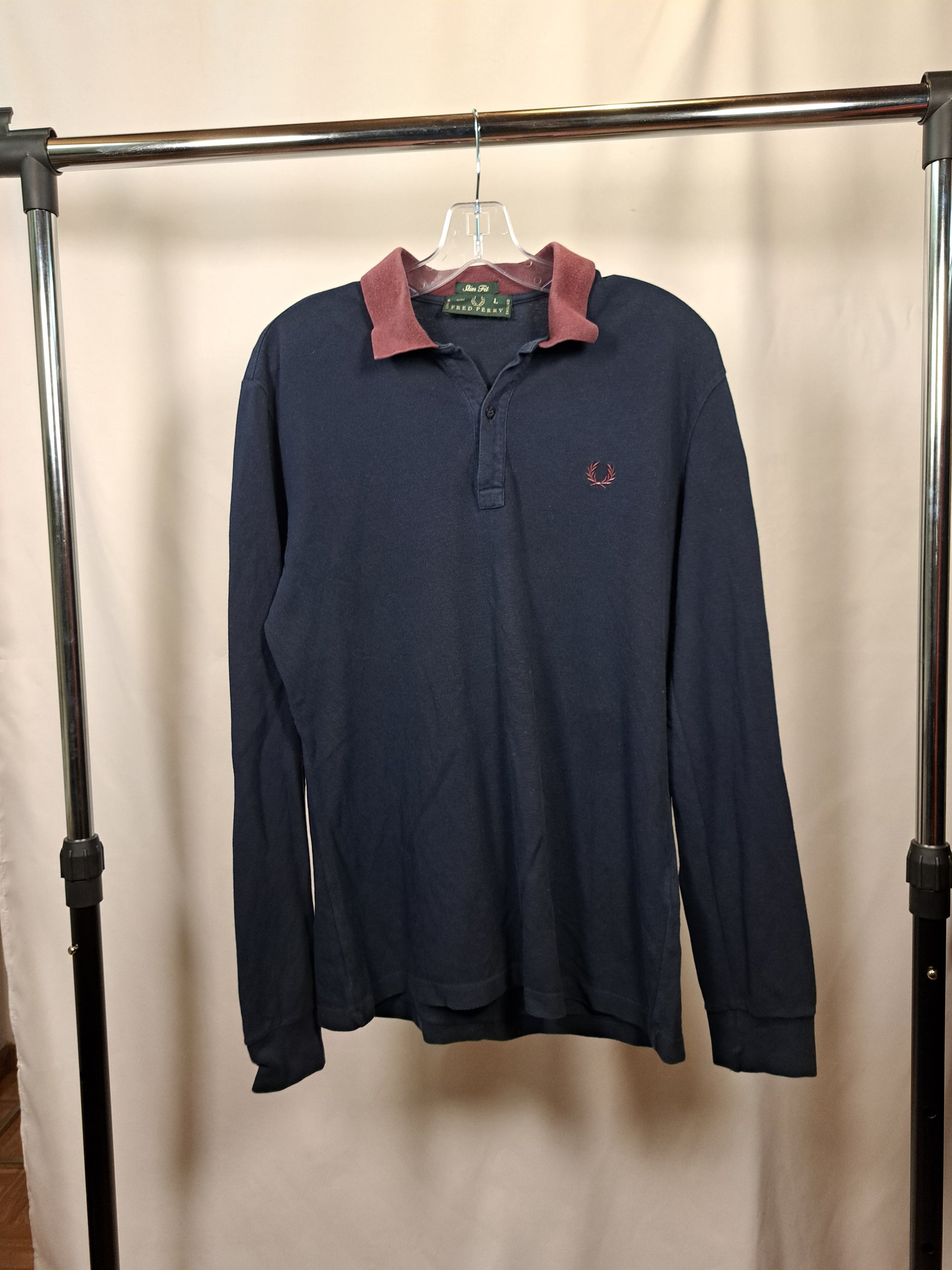 Fred Perry Vintage Longsleeve Polo / Navy–Burgundy Contrast Collar / Shirt Size L